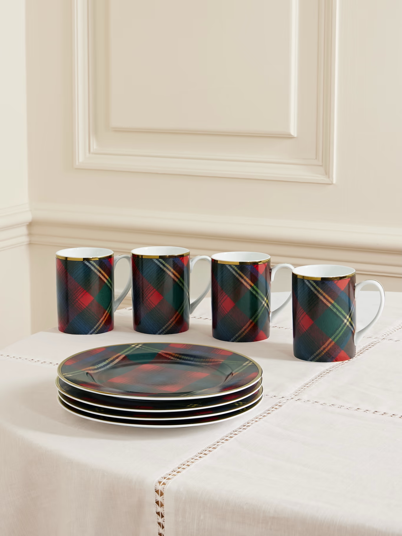 Cuando juntas el tartán con la calidad de Ralph Lauren, el resultado es obvio: una mesa donde dan ganas de quedarse horas. La colección Wexford tiene toda la herencia de la marca: los cuadros clásicos, los bordes dorados y esa apariencia como de club inglés que tanto le gusta al diseñador. Cada pieza, desde el plato de postre hasta la taza, es un detalle que suma delicadeza y esa onda timeless que nunca pasa de moda. Pero definitivamente es en Navidad cuando esta colección brilla en absoluto. Sus colores, entre los que están burdeos, verde bosque y azul marino, quedan perfectos con centros de mesa naturales, velas y cristalería vintage. Es la clase de vajilla que hace que hasta la comida más simple se vea increíble, incluso un sándwich.