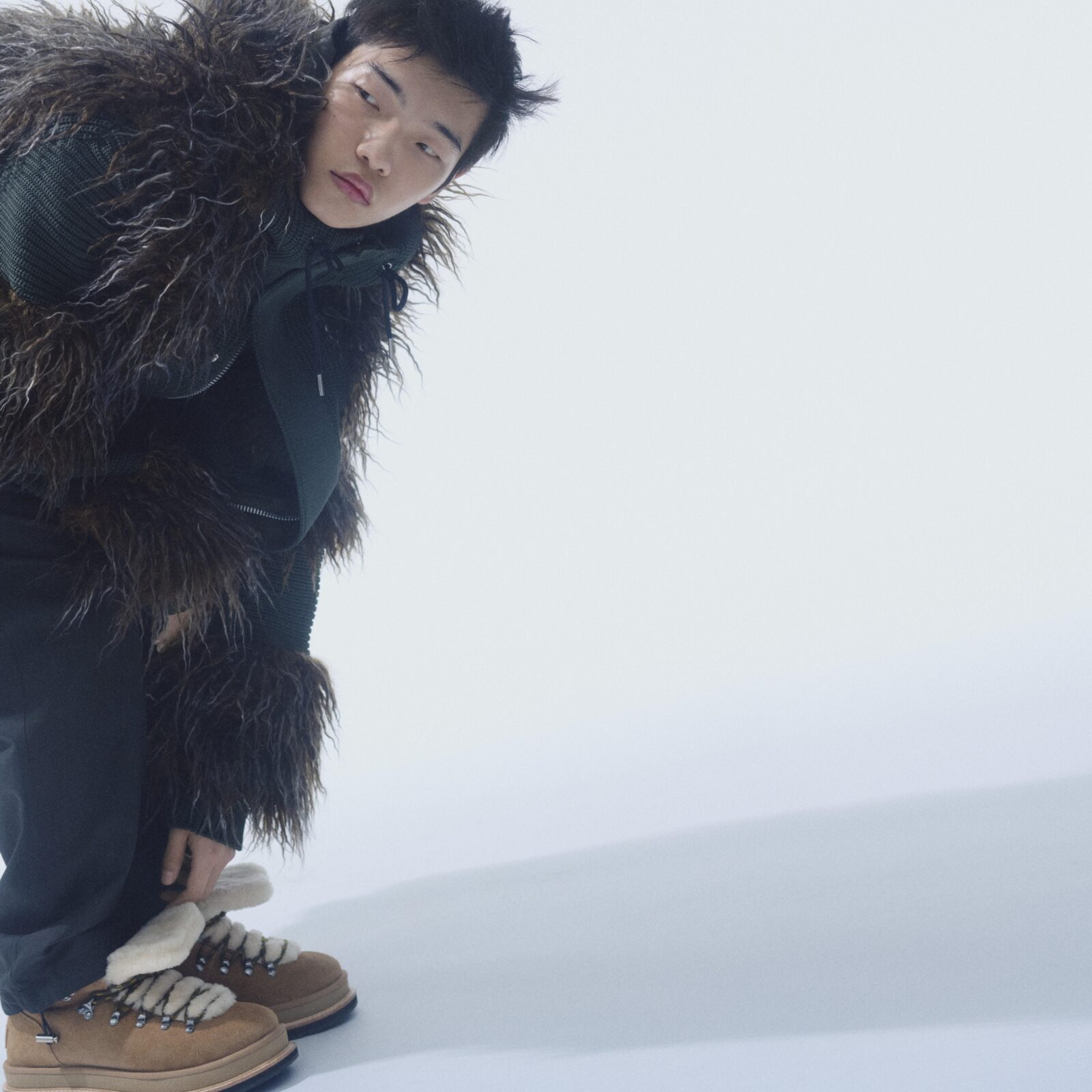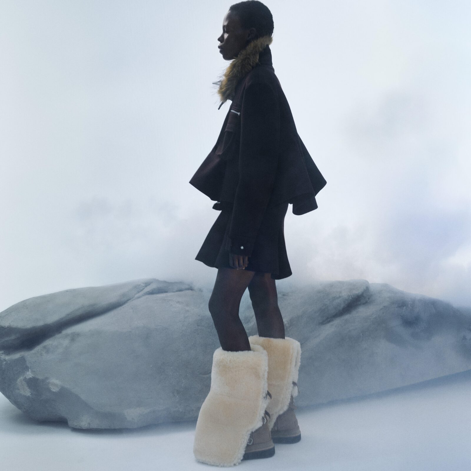 La campaña lleva ese diálogo a paisajes minerales, donde la rudeza del entorno resalta la sofisticación técnica de las piezas. Las botas y mocasines se funden con looks completos de la colección Otoño/Invierno 2025 de Sacai, revelando que la colaboración no es un simple ejercicio comercial, sino una extensión natural del universo de la diseñadora. Allí, entre rocas y viento, los materiales tradicionales de UGG —ante suave, piel de oveja, forros mullidos— se recontextualizan y adquieren una presencia escultórica.