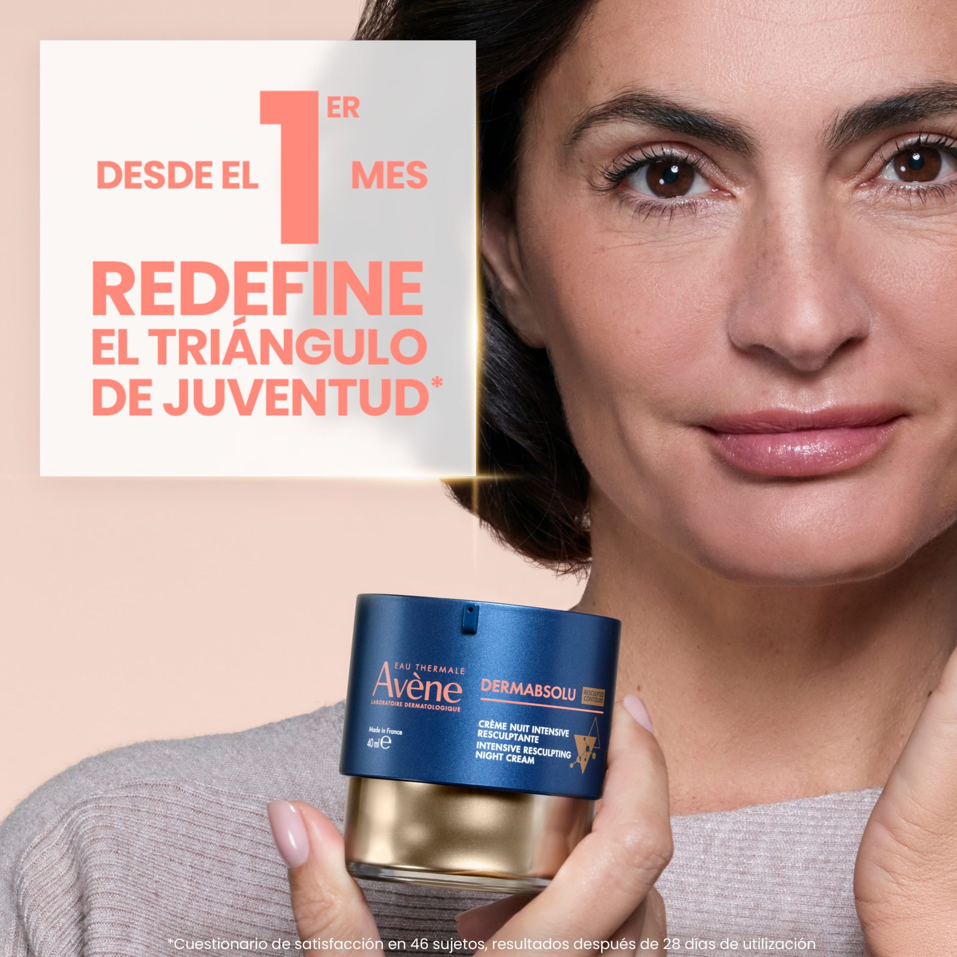 DermAbsolu actúa durante el descanso nocturno para redefinir el óvalo facial, recuperar la densidad perdida y devolverle a la piel su luminosidad natural. Su fórmula única combina: