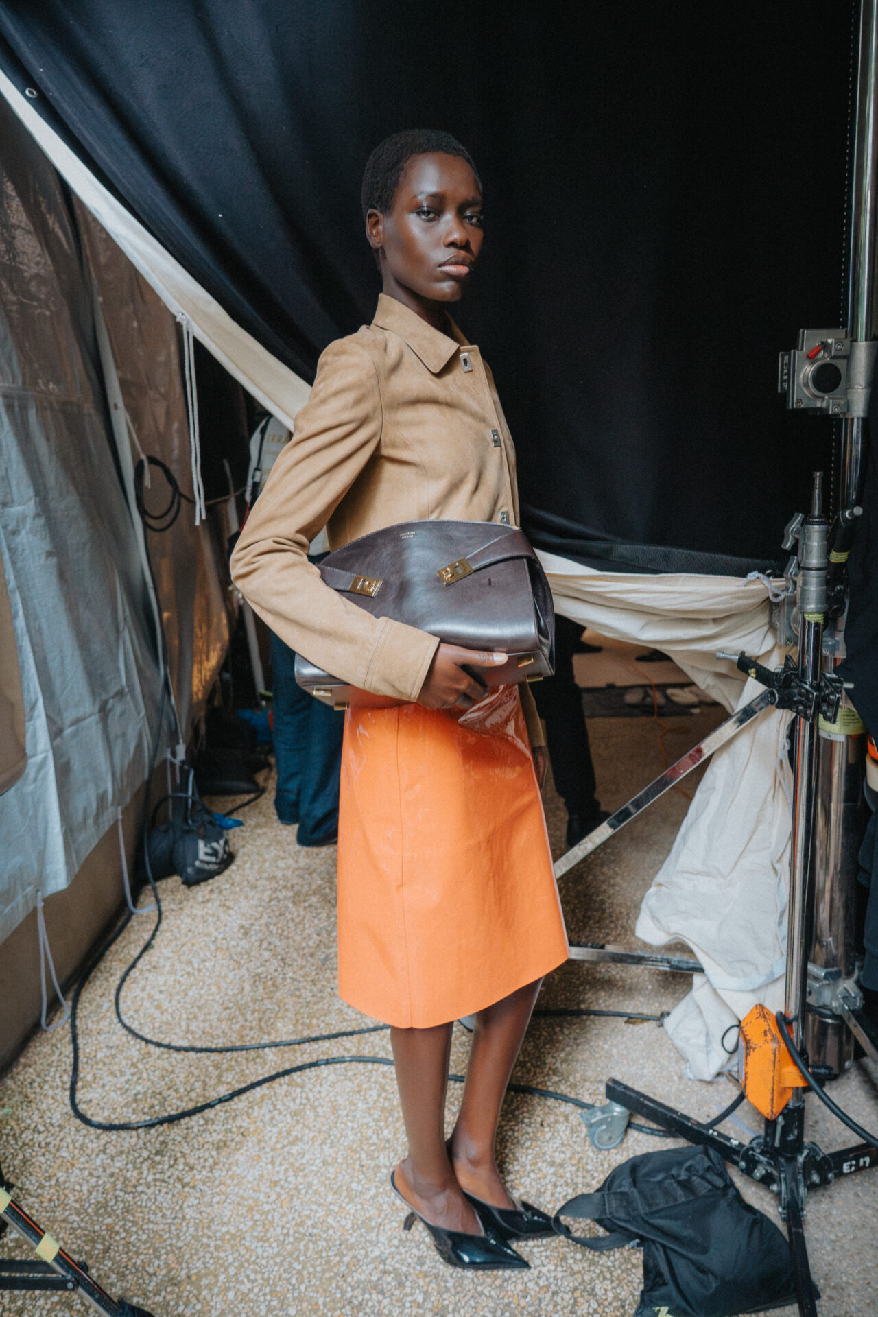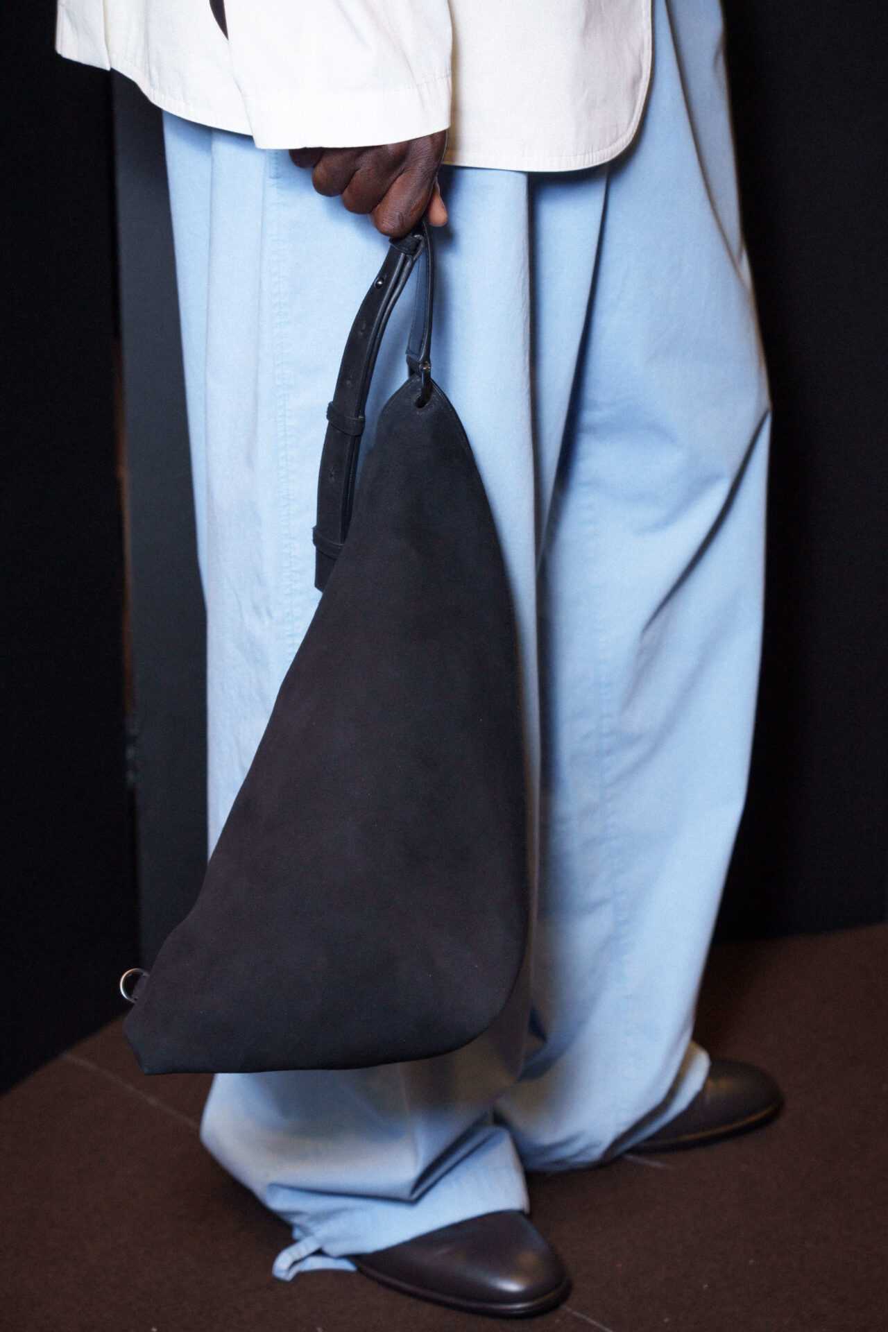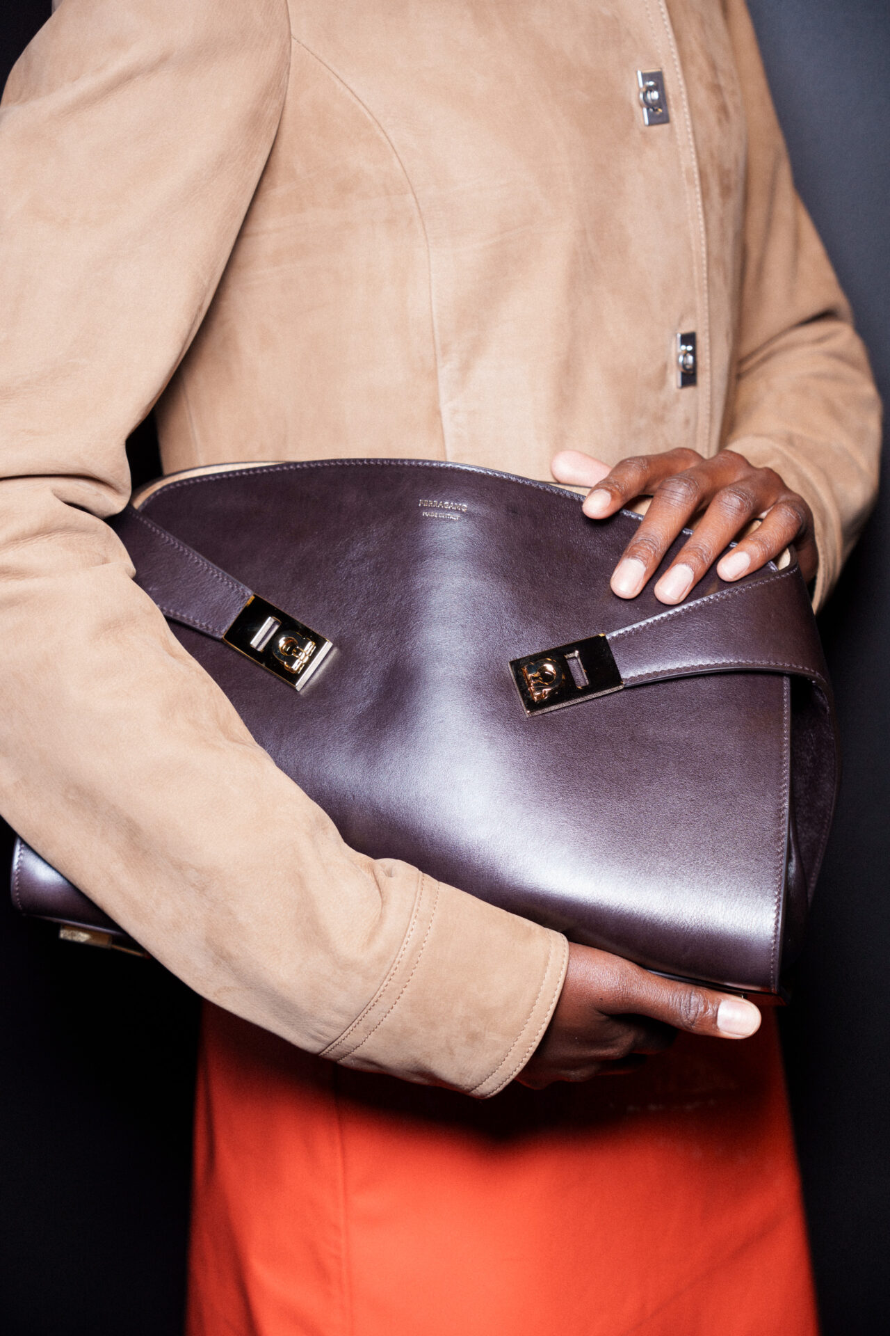 En accesorios, el icónico bolso Hug aparece en nuevas interpretaciones y materiales, en charol y pieles tejidas, cocodrilo estampado y ante nobuck, junto al bolso plegado inspirado en el foulard en los colores y estampados de la temporada, con herrajes Gancini desmontables. Un elegante bolso de muñeca, adaptado de los archivos, se decora con un broche Gancini dorado, mientras que las plumas estallan sobre otro modelo y aparecen como flecos en los bordes del bolso Soft. En la propuesta masculina, la artesanía se celebra mediante paneles de piel tejida que recorren los bolsos Hug y Sailor.