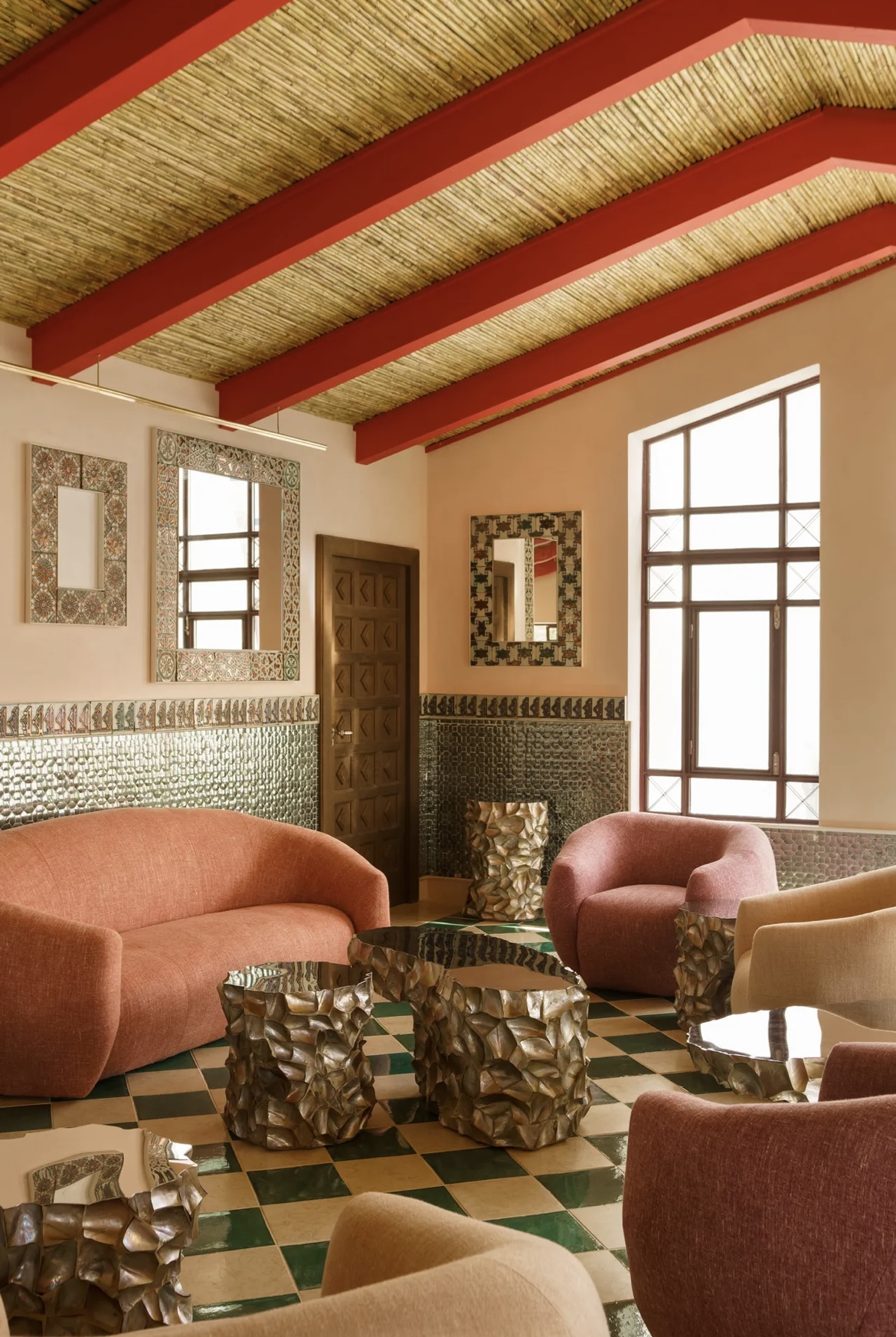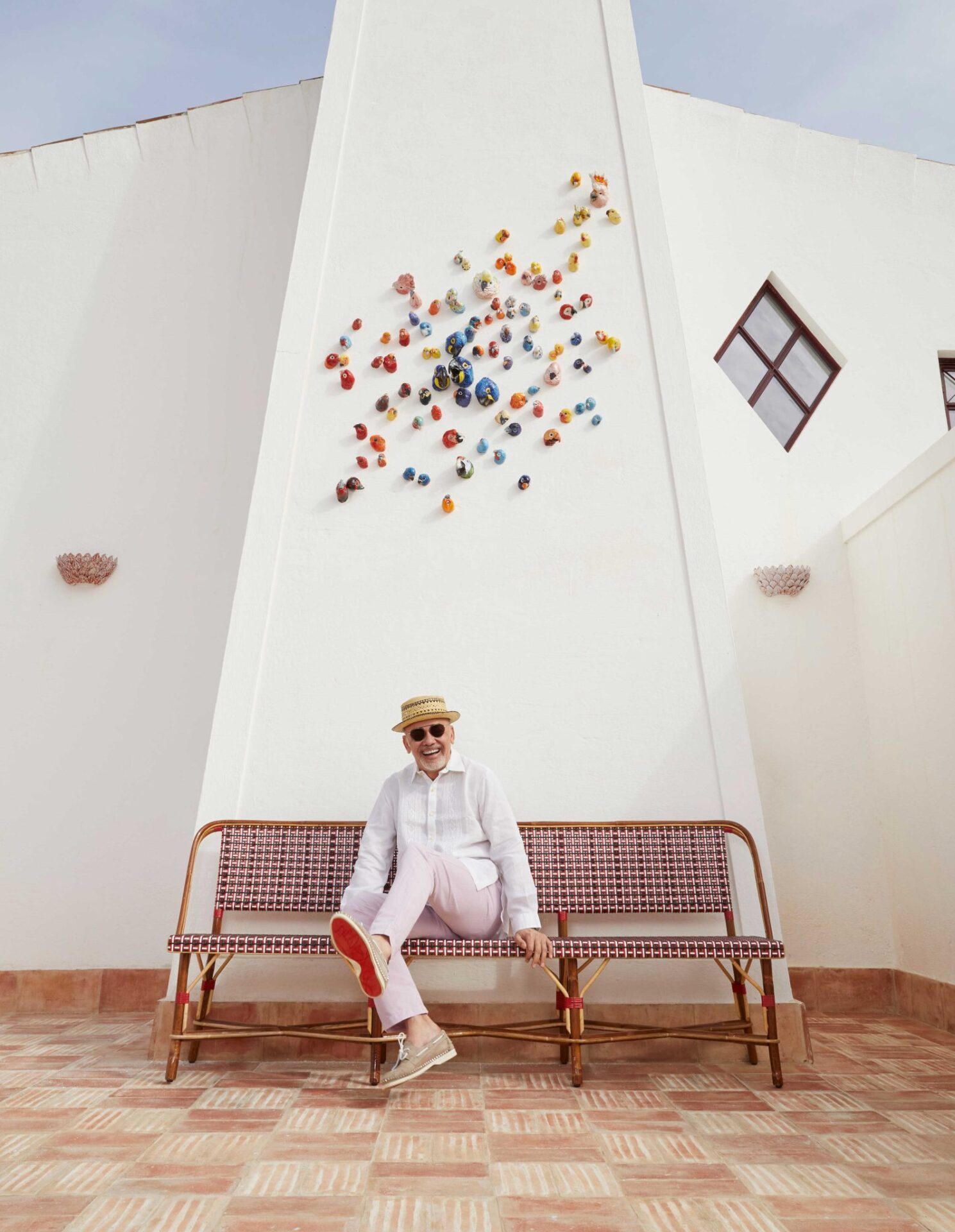 El sello Louboutin se manifiesta de forma sutil pero constante. El rojo, tan ligado a su universo, aparece en detalles precisos y no como protagonista absoluto. Artesanía local, piezas de arte, azulejos hechos a mano y muebles cuidadosamente seleccionados se fusionan en un equilibrio perfecto. Nada está organizado al azar, pero tampoco forzado. El espacio evita la neutralidad y el minimalismo propio de muchos hoteles, sino que apuesta por una identidad clara, reconocible y coherente, donde su estética dialoga con la historia personal del diseñador y con el entorno que lo rodea.