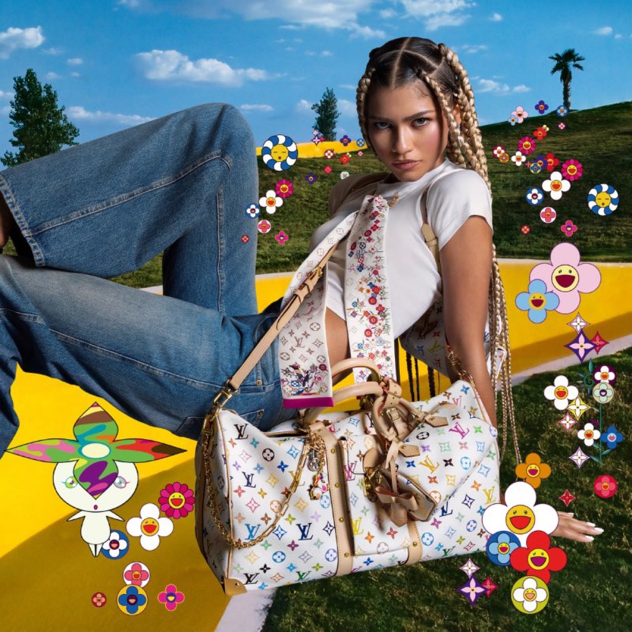 Veinte años después del lanzamiento de la legendaria Monogram Multicolore, Murakami y Louis Vuitton nos invitan a un viaje al pasado reinterpretado con un toque contemporáneo. En las imágenes filtradas, Zendaya luce impecable con jeans acampanados, una camiseta blanca y un pañuelo de seda estampado con los vibrantes motivos florales del artista japonés. Como pieza central, destaca el bolso Keepall en su versión renovada: un lienzo blanco con los emblemáticos colores y gráficos de Murakami. Todo esto en un escenario digitalizado que combina naturaleza y fantasía, evocando las raíces artísticas de la colección original.